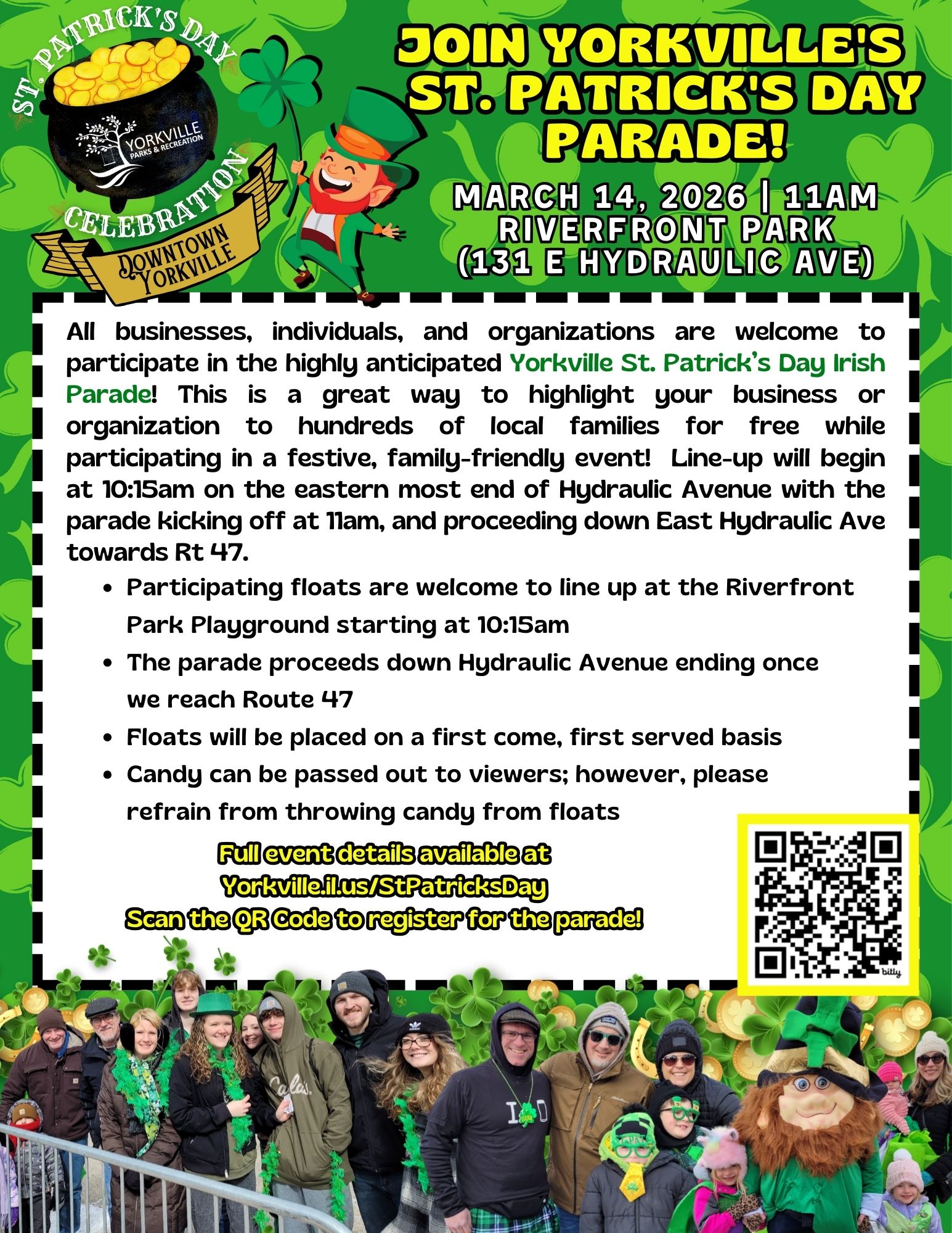 Grab your green shirts and shamrocks and join the Yorkville Parks and Recreation Department and several local businesses for the Annual St. Patrick’s Day Parade on Saturday, March 14! The parade starts at the easternmost end of Hydraulic Ave and continues down East Hydraulic ending at Route 47. All parade spectators are asked to line up along Riverfront Park on the north end of the road.